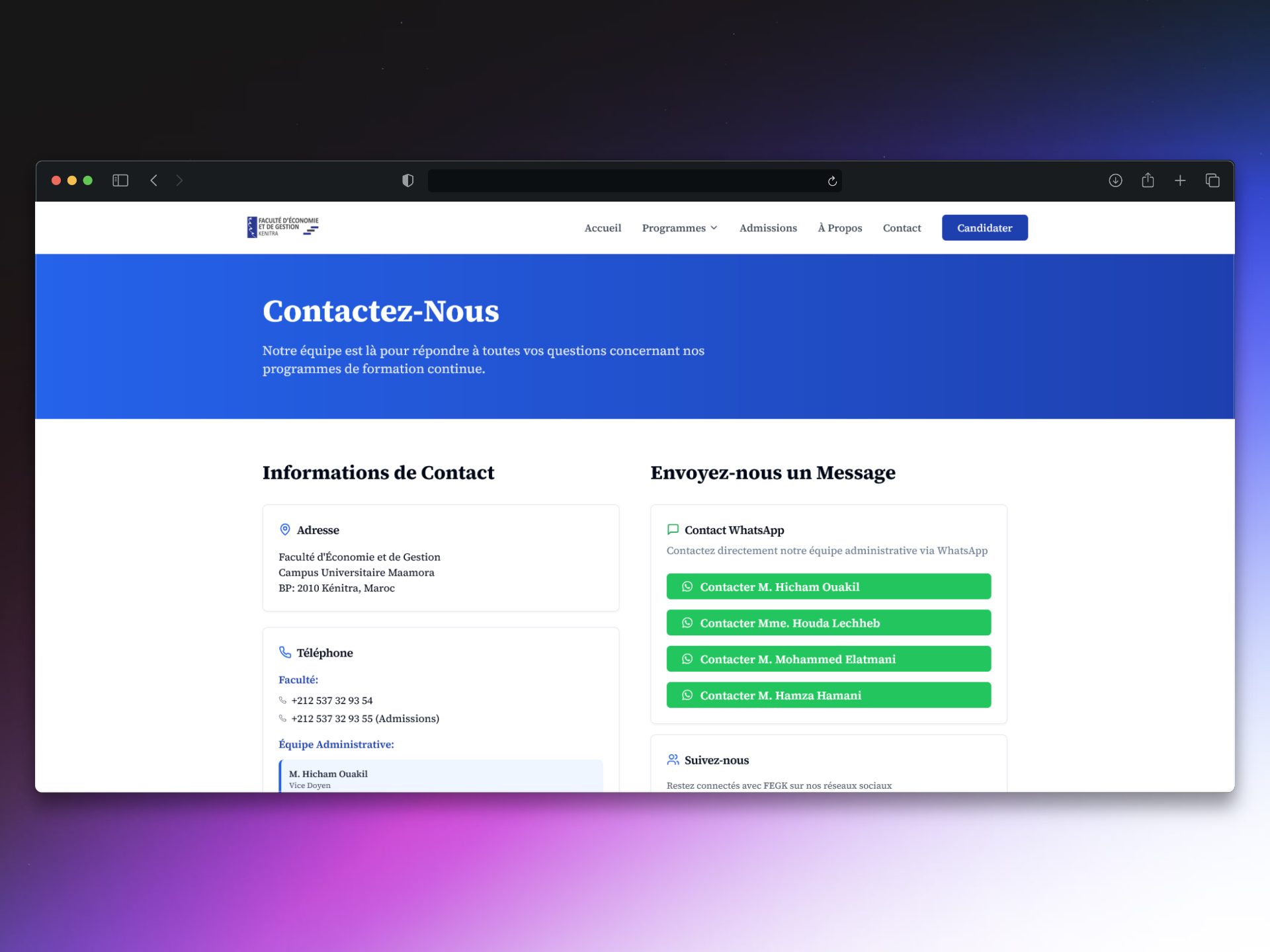 A comprehensive website for my university's FEKG Formation program, featuring detailed information on 4 academic formations. Built with the latest Next.js and TypeScript, it includes a modern UI using shadcn/ui, advanced SEO optimization, and a responsive design. The site provides easy navigation between formations, up-to-date content, and seamless integration with external resources. Ongoing updates ensure the platform remains current and valuable for students and faculty.